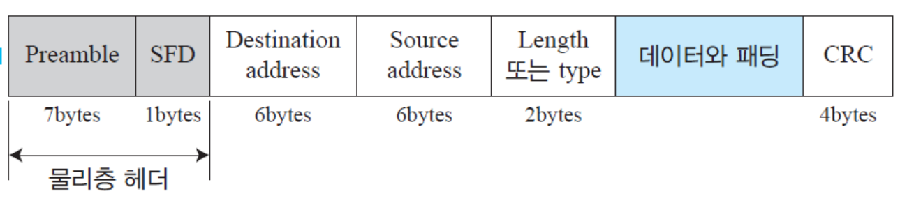 근거리 통신망 LAN 지역적으로 제한된 지역에서 독립적인 장치들이 서로 통신할 수 있는 데이터 통신 시스템을 일컫는다. 오늘날 LAN들은 대부분 WAN(광역 통신망)이나 인터넷에 연결한다. IEEE 표준 이더넷 무선 통신을 전제로 해서 단일 주파수 통신을 하는 무전기처럼 타인에게 이야기하는 동안은 그 상대방은 수신만 가능하다. CSMA/CD(충돌검출)방식을 사용한다. 논리 링크 제어 LLC : 흐름제어, 오류제어, 프레임 생성 일부분의 역할을 처리하는 부계층이다. 서로 다른 LAN 사이에 연결성을 제공하기도 한다. 매체 접근 제어 MAC : 프레임을 만드는 기능의 일부나 토큰에 대한 방식을 정의하는 기능을 담당한다. 이더넷 II 프레임 형식 프레임은 다음과 같은 6개 필드로 구성된다. 프리엠블 목적지 주..