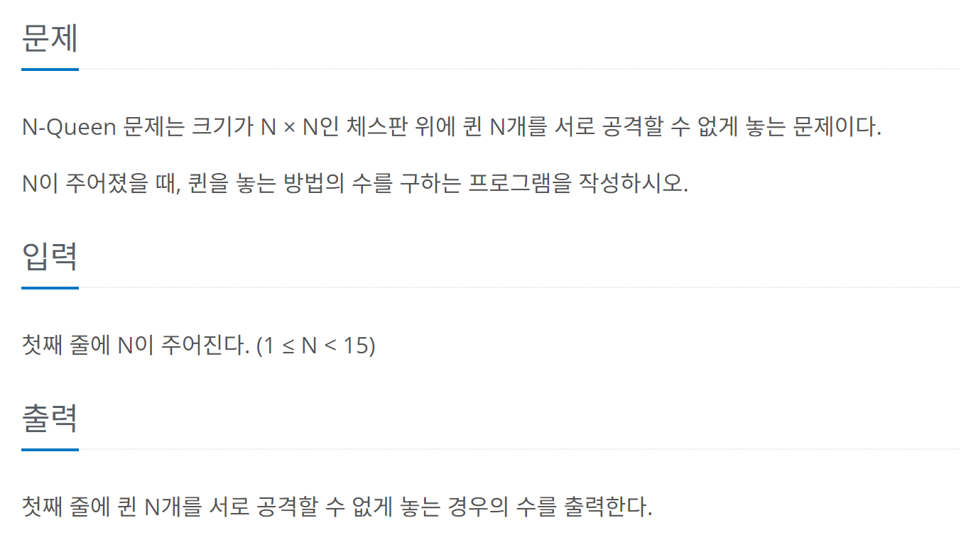 백트래킹이란?백트래킹은 해를 찾는 과정에서 여러 가능성을 탐색하다가, 특정 경로가 잘못되었음을 알게 되면 되돌아가서 다른 경로를 시도하는 문제 해결 기법이다. 모든 가능한 경우의 수를 탐색하지만, 가지치기(pruning)를 통해 비효율적인 경로를 배제하여 효율성을 높인다. 다시 말해, 완전 탐색(브루트 포스)의 개선된 형태라 할 수 있다. 단순히 요약하자면, 백트래킹은 "이 길이 아닌 것 같을 때 원래 왔던 길로 되돌아가서 다른 길을 가보는 것"이다. 이는 특성으로 알 수 있듯이 대부분 DFS로 구현할 수 있다. 백트래킹의 예시이번 예시는 9663번 N-Queen 문제를 기준으로 하겠다. 먼저 구현 문제를 보자. 문제 자체는 백트래킹을 잘 활용해야 풀 수 있다. 나는 문제를 다 읽고 2차원 배열로 풀..